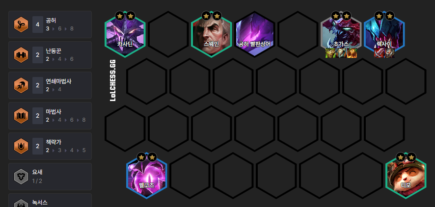 초반에 가장 쌘 조합이라 이렇게 가다가 보통 6렙부터 슬슬 조합을 교체하는 식으로 많이 플레이 합니다.